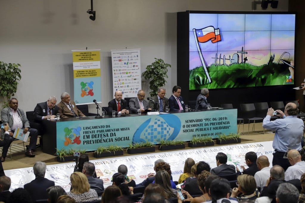 Dentre os palestrantes estava o cientista político da Fundación Sol e especialista previdenciário no Chile, Recaredo Galvez, que apresentou um panorama das consequências do regime de capitalização implantado em seu país, o presidente da Confederação Latino-Americana de Trabalhadores Estatais (CLATE), que fez um diagnóstico do sistema previdenciário na América Latina e na Argentina, o advogado e presidente da Sociedade Brasileira de Previdência Social, José Pinto da Mota Filho, o diretor técnico do Dieese, Clemente Gaz Lúcio, o consultor de entidades sindicais de servidores, Vladimir Nepomuceno, o professor de assessor jurídico da Confederação Nacional dos Trabalhadores na Agricultura (Contag), Evandro Morello e o doutor em Ciência Econômica, mestre em Ciência Política e professor do Instituto de Economia da Universidade Estadual de Campinas (Unicamp), Eduardo Fagnani, que apresentou como alternativa para a Reforma da Previdência, o projeto Reforma Tributária Solidária, como meio de alavancar a arrecadação sem precisar reduzir o benefício dos aposentados.