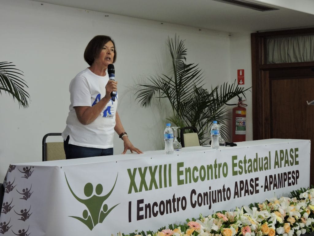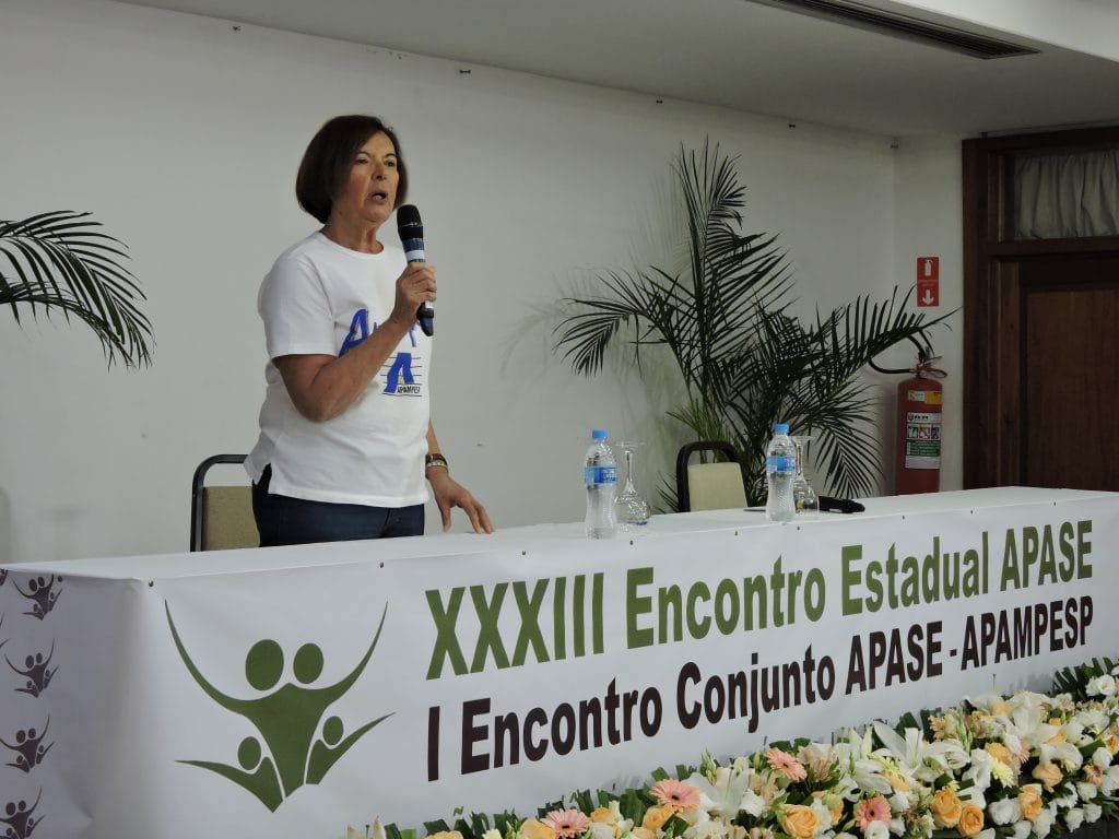 A professora Aldah de Lima, vice-presidente de Conselho Deliberativo da Apampesp, acaba de proferir uma palestra sobre a atuação da nossa Entidade em defesa do professor aposentado durante a tramitação do Plano Nacional de Educação, em Brasília. A apresentação integra o último dia da programação do XXXIII Encontro Estadual Apase e I Encontro Conjunto Apase-Apampesp, que acontece até hoje, 8 de novembro, no Vacance Hotel, em Águas de Lindóia.