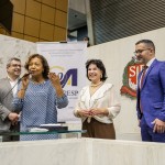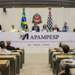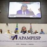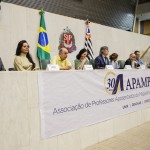 Compondo a mesa, estiveram a presidente da Apampesp, professora Walneide Romano; a diretora presidente da Apase, professora Rosaura Almeida; o secretário-geral da Udemo, professor Luiz Gonzaga; a deputada federal Luciene Cavalcante; o presidente da PÚBLICA – Central do Servidor, José Gozze; a vereadora por Presidente Prudente Joana D’Arc; e o presidente da CNSP, Antonio Tuccilio.
