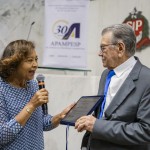 Em seguida, foi exibido um vídeo institucional que resgatou momentos marcantes dos 30 anos da Apampesp, antes da entrega oficial de uma placa da Alesp em homenagem à Entidade. A professora Walneide Romano, por sua vez, entregou uma placa de associado ilustre ao professor Reinaldo Lourenço Siqueira, em reconhecimento por seu papel como primeiro dirigente regional de Presidente Prudente e seu empenho no processo de fundação da Apampesp.