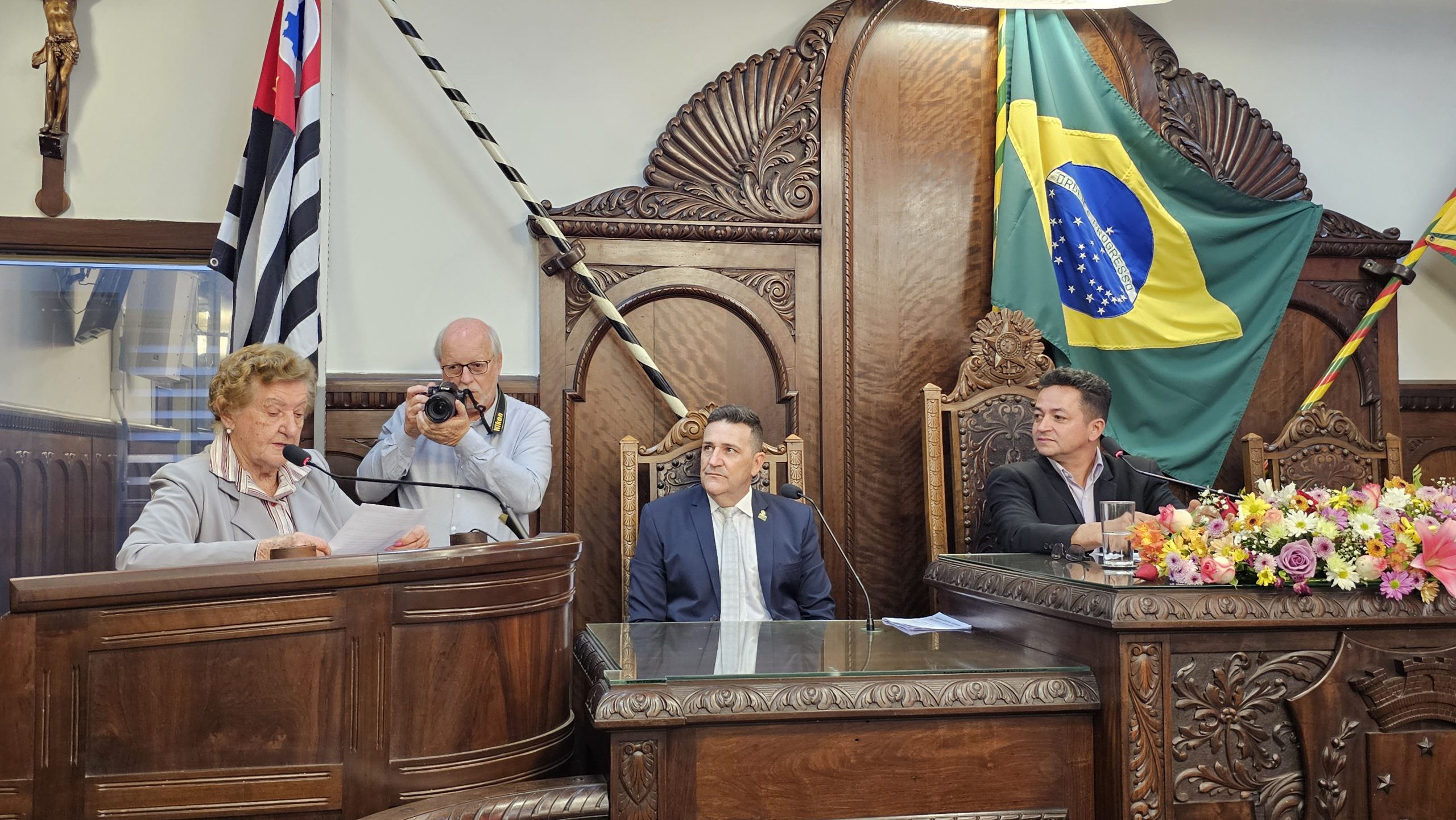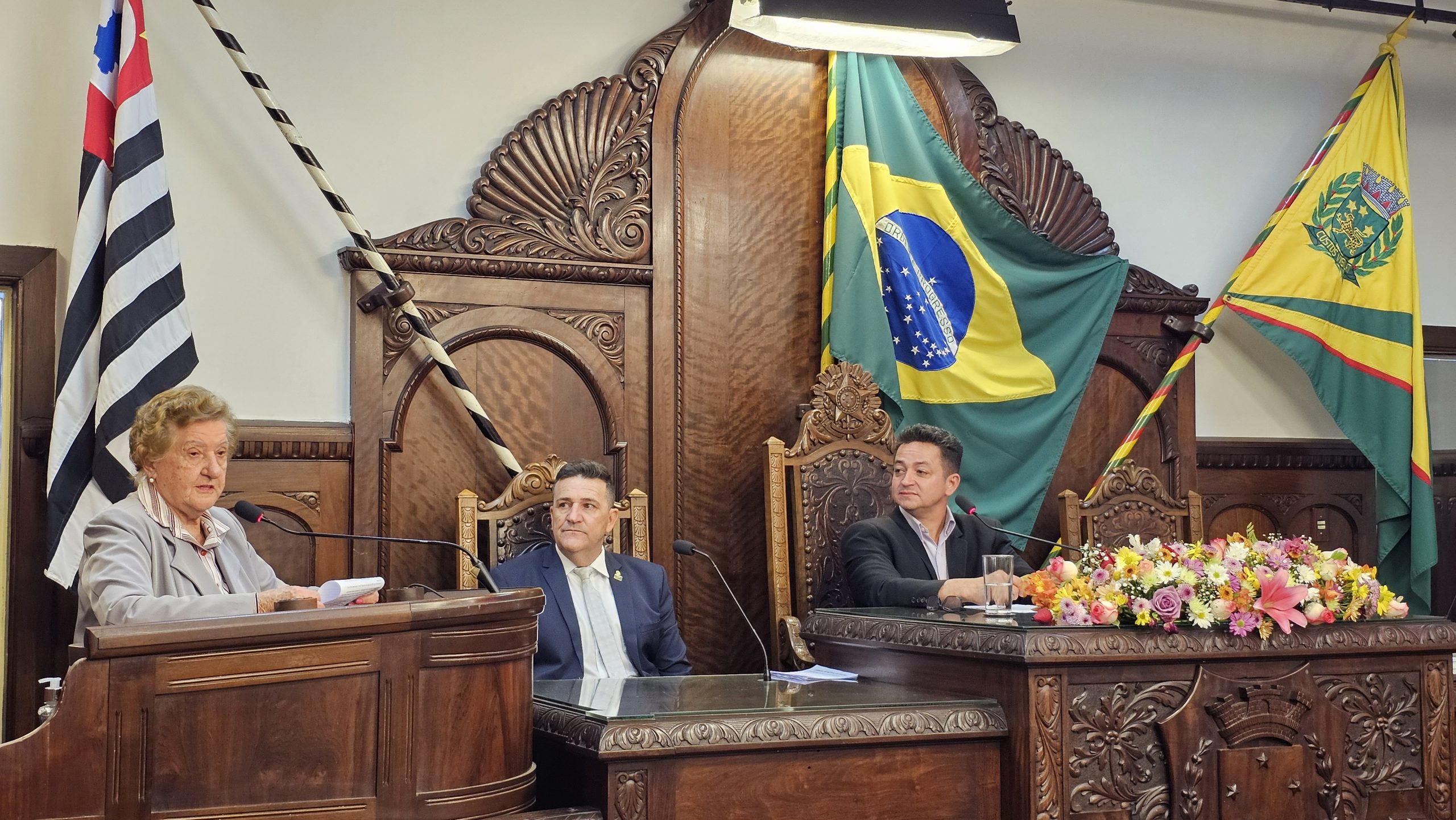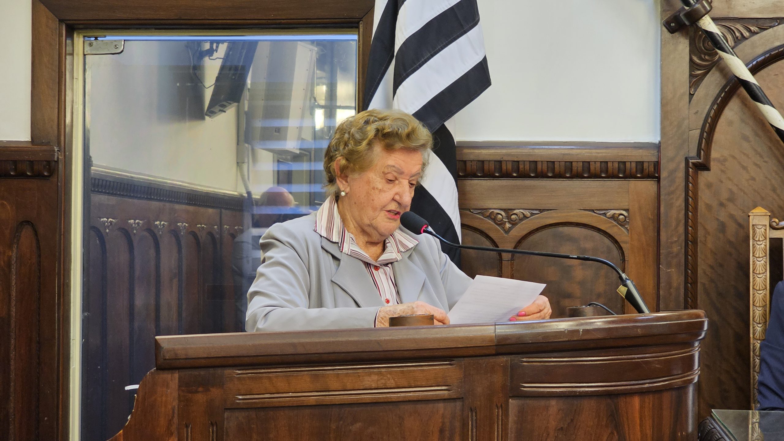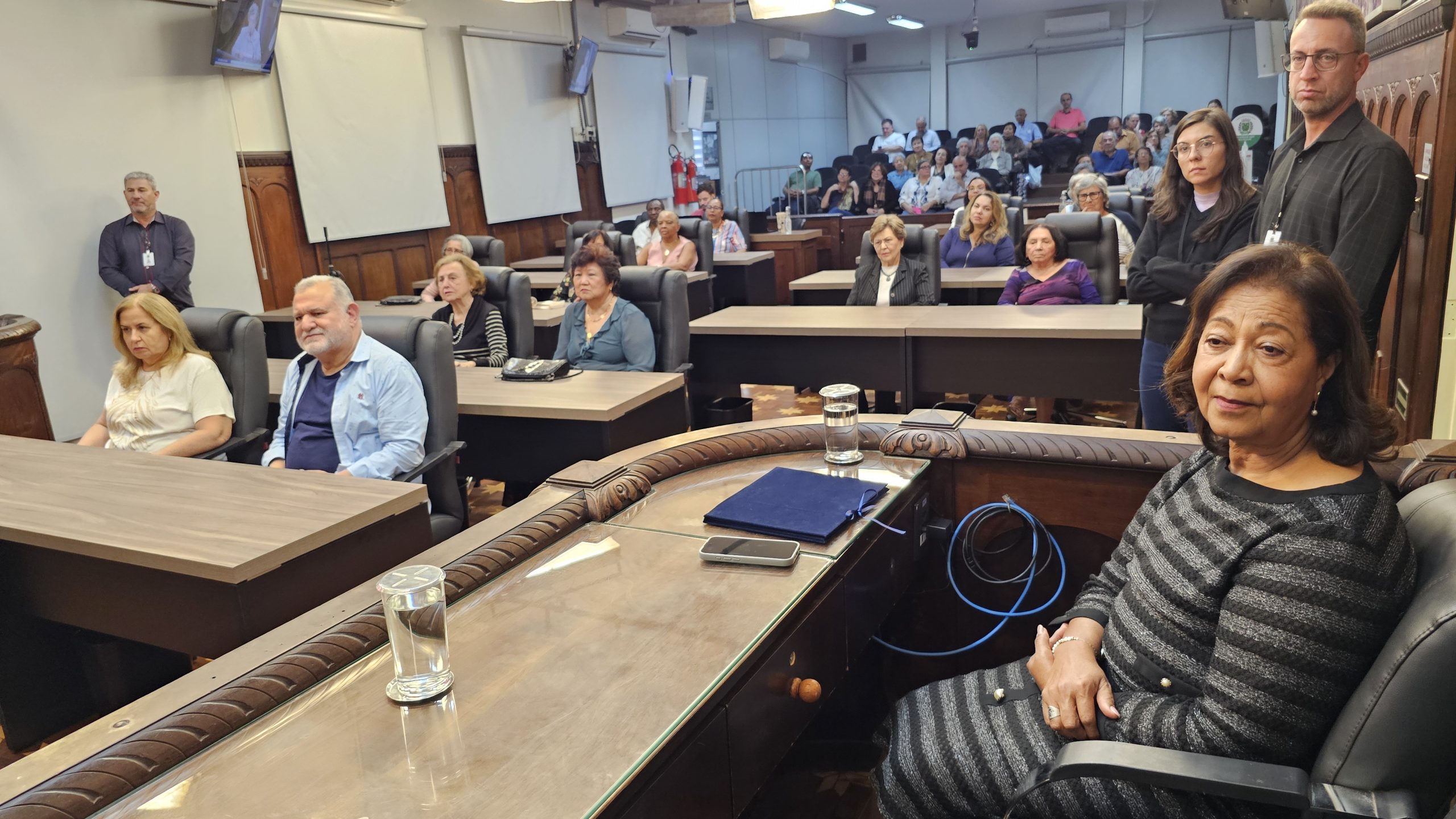 Após receber a medalha, a professora Danila Zamboni ocupou a tribuna e emocionou o público ao rememorar as bandeiras que pautaram sua vida profissional, destacando especialmente a defesa dos aposentados do magistério. Ela ressaltou que a homenagem a tocava profundamente, por reconhecer um percurso marcado pelo compromisso com a educação pública e pela atuação ao lado da Apampesp desde sua criação.