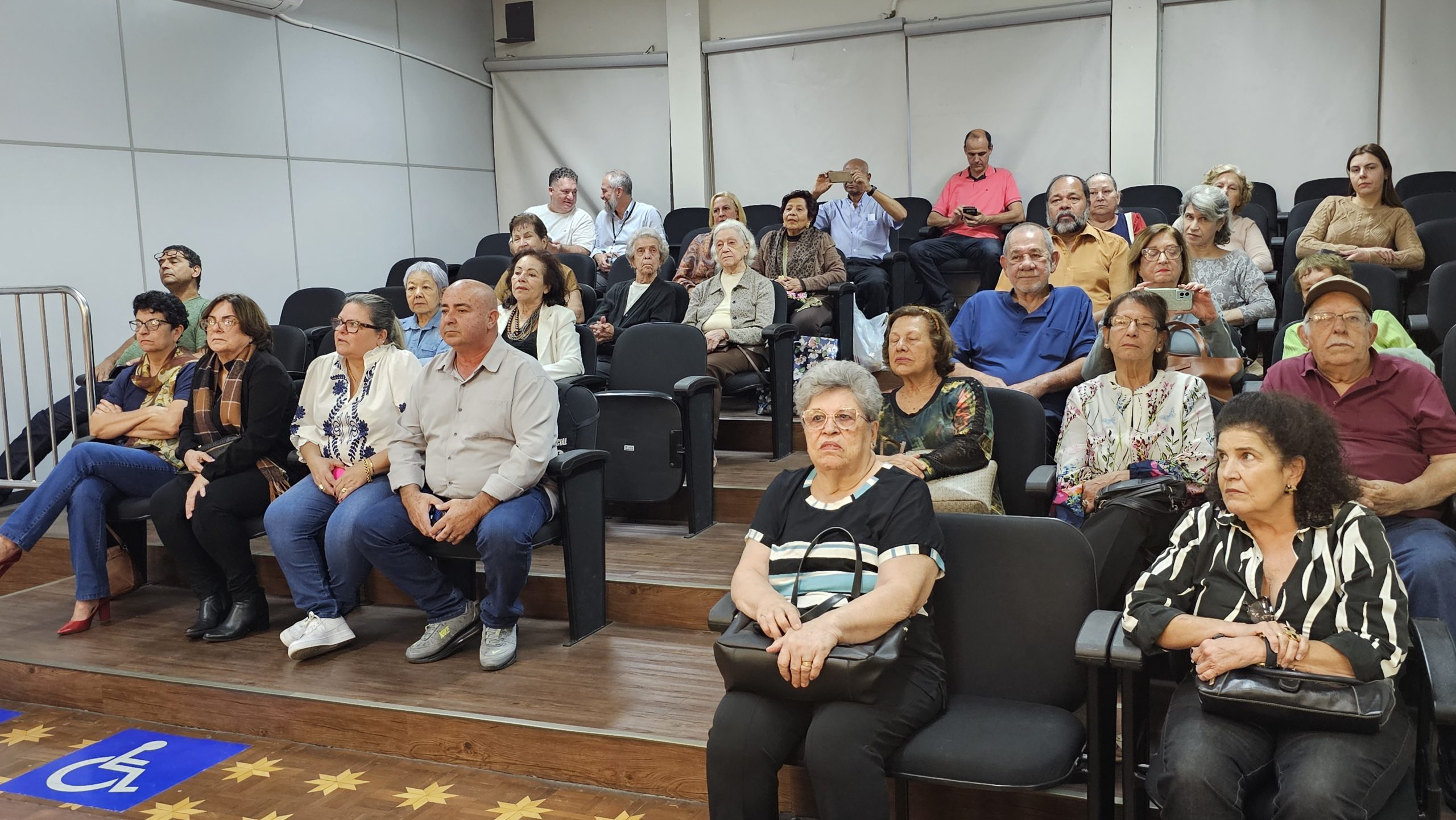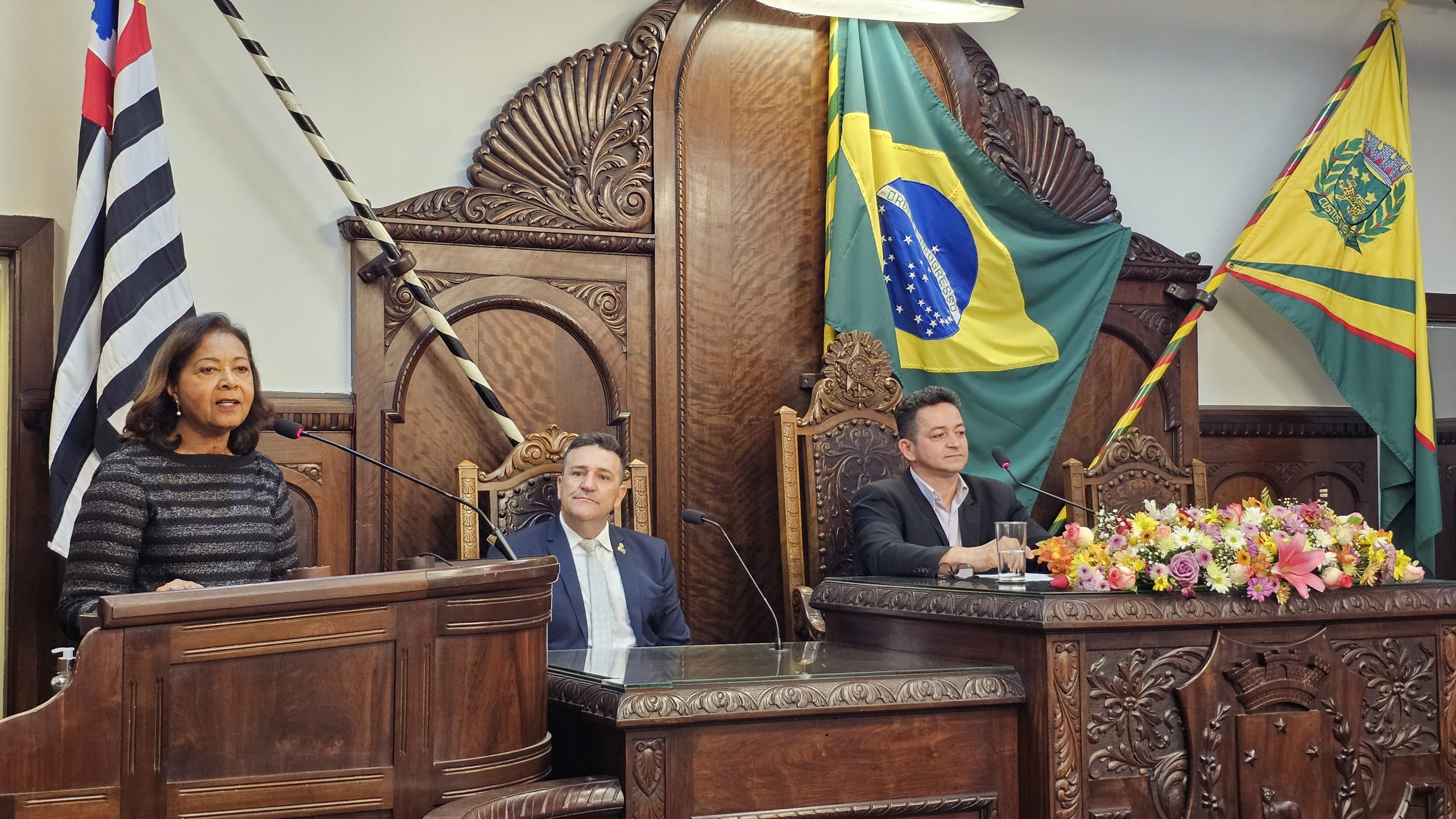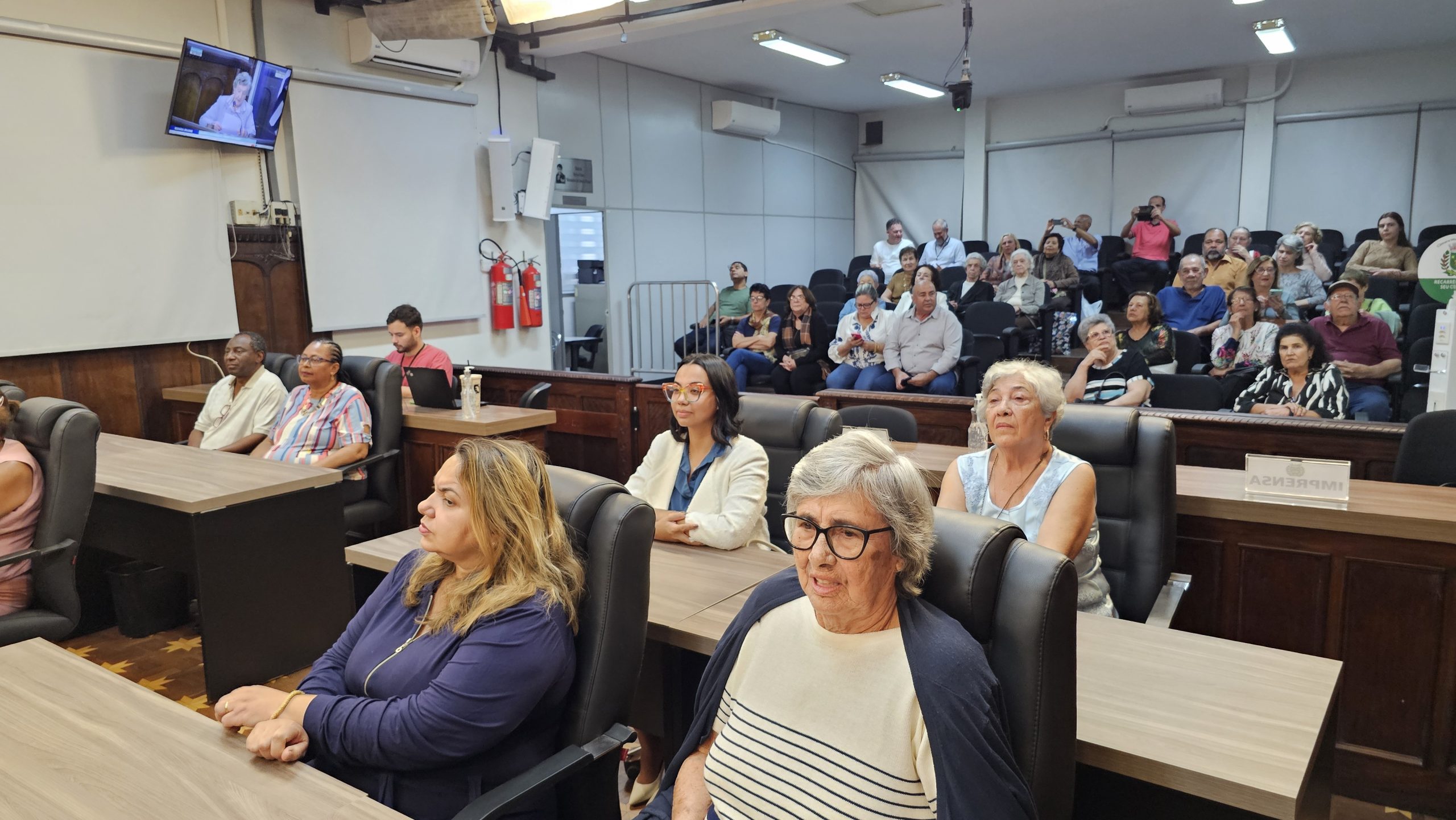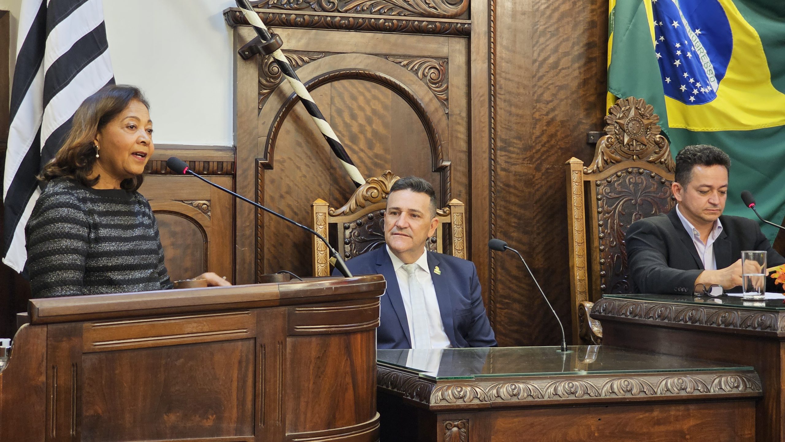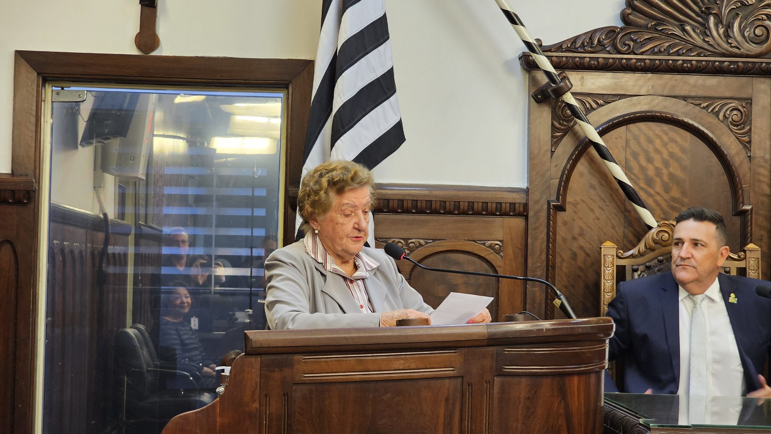 Após receber a medalha, a professora Danila Zamboni ocupou a tribuna e emocionou o público ao rememorar as bandeiras que pautaram sua vida profissional, destacando especialmente a defesa dos aposentados do magistério. Ela ressaltou que a homenagem a tocava profundamente, por reconhecer um percurso marcado pelo compromisso com a educação pública e pela atuação ao lado da Apampesp desde sua criação.
