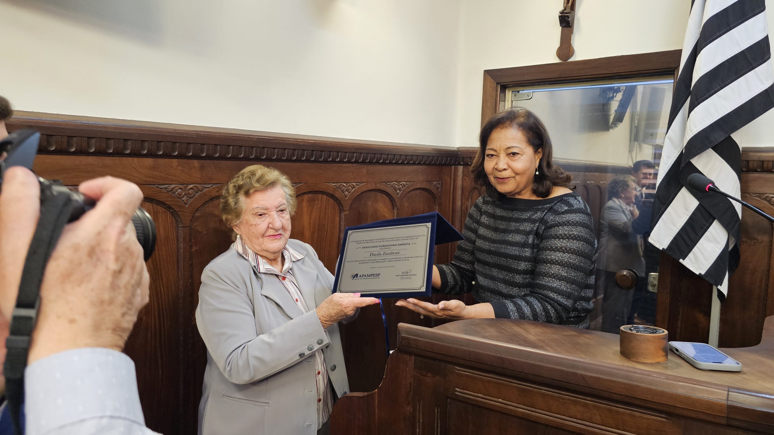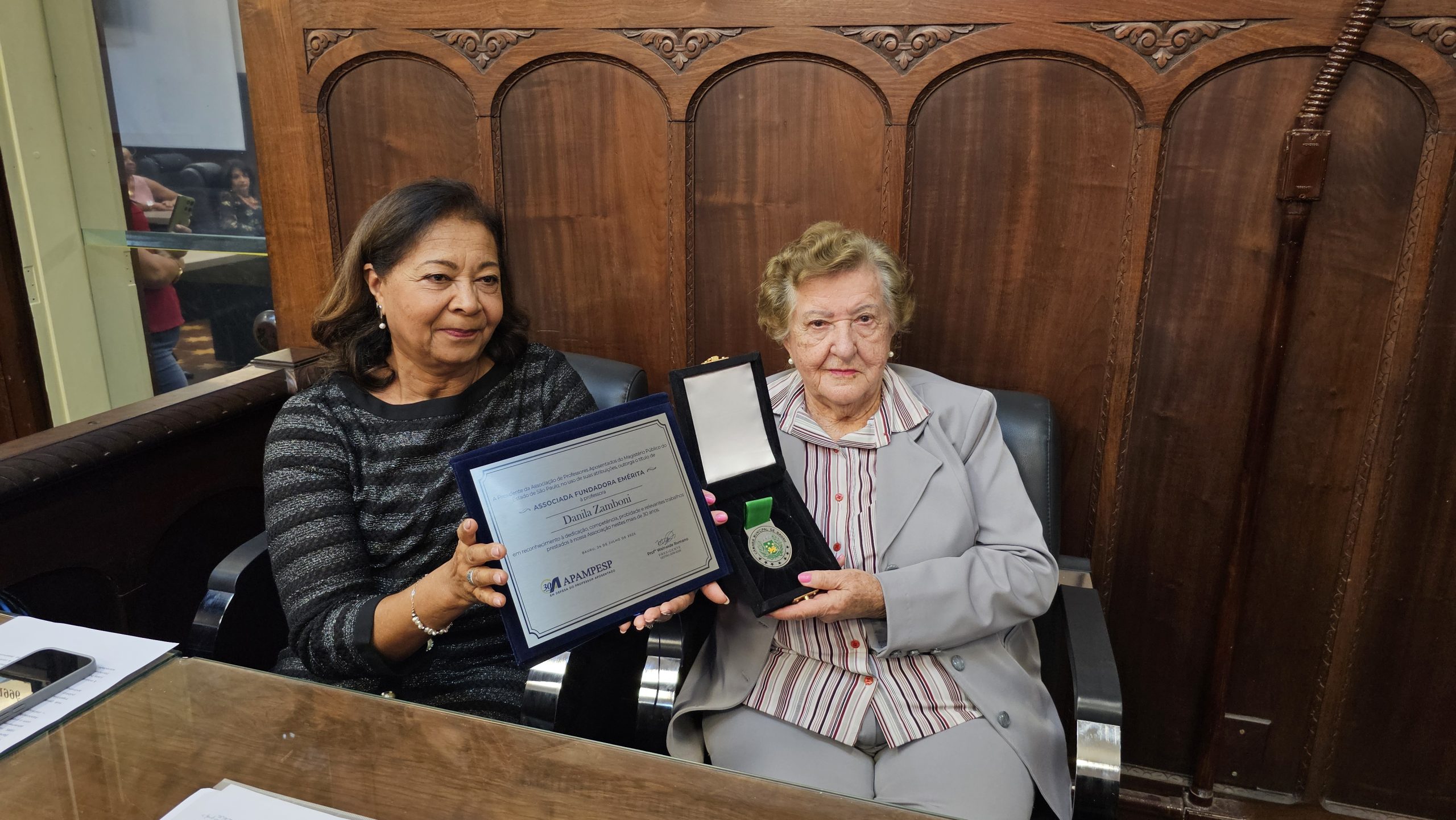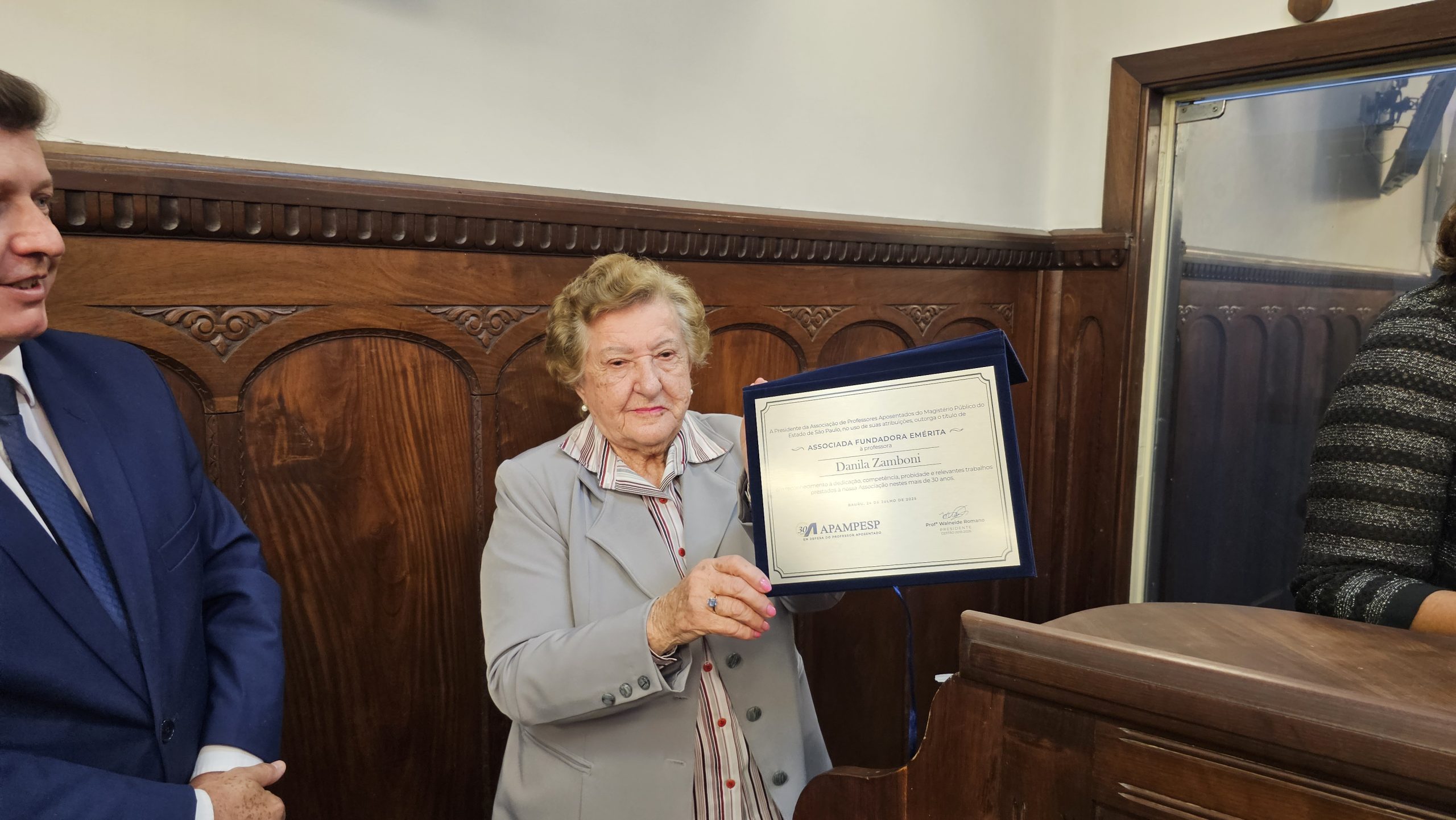 A presidente da Apampesp, professora Walneide Romano, também fez uso da palavra durante a solenidade. Ela destacou a relevância da homenagem na história de Danila Zamboni e ressaltou como sua atuação na construção da Entidade inspirou gerações de educadores a se engajarem na defesa dos aposentados. Em seguida, a professora Walneide entregou à professora Danila uma placa de Associada Fundadora Emérita, reconhecendo oficialmente sua dedicação e contribuição à Associação.