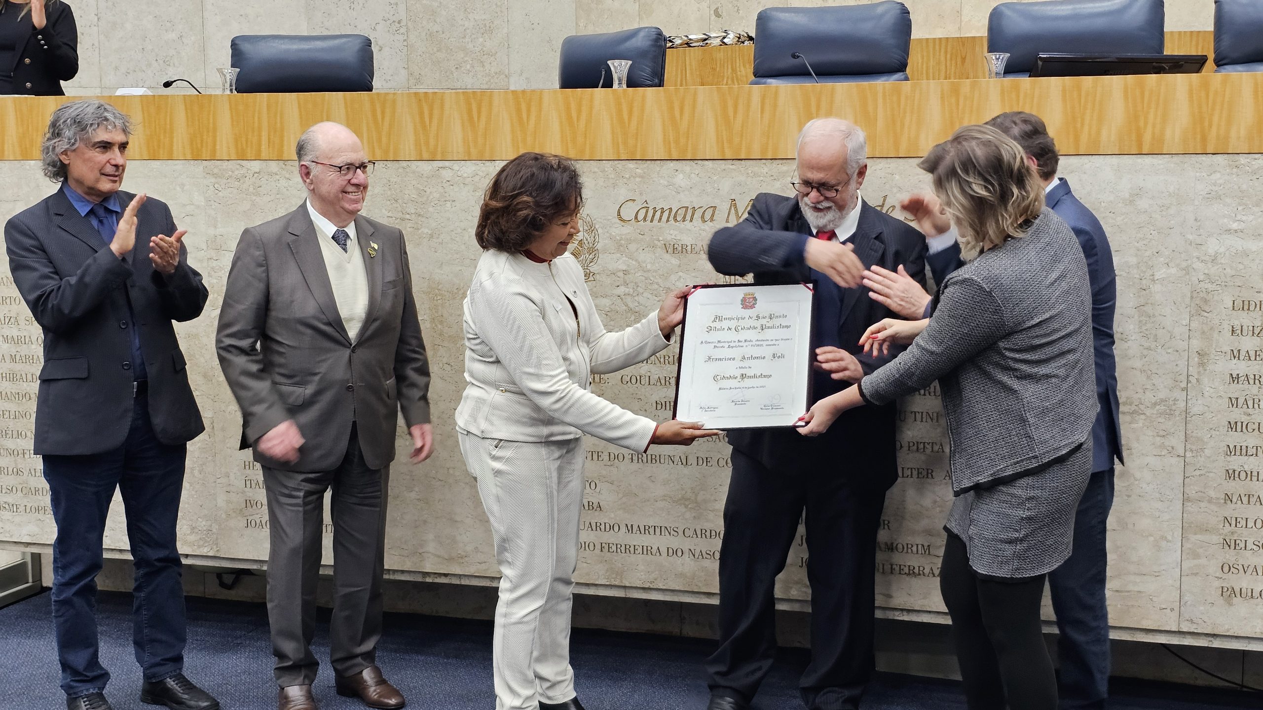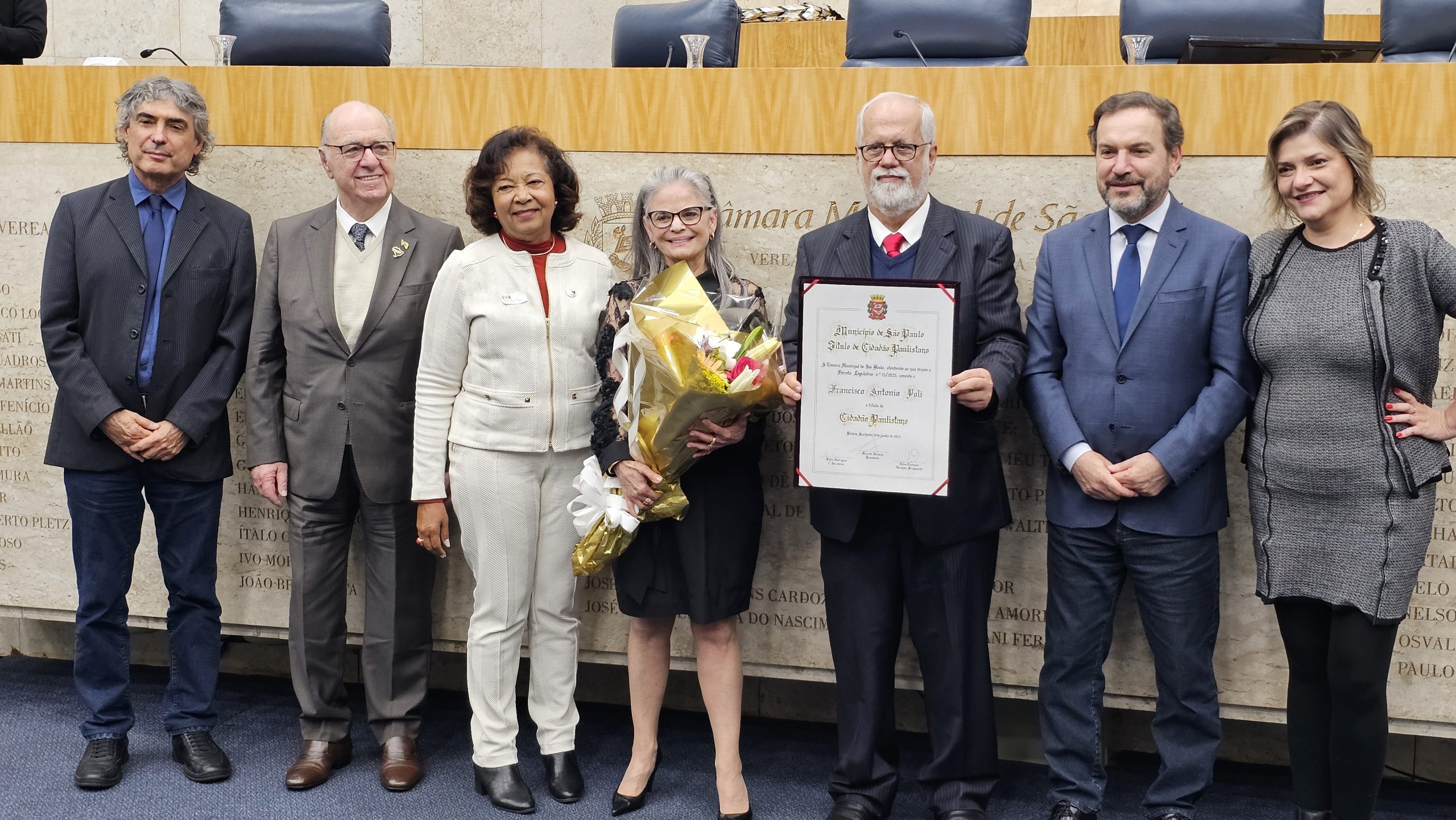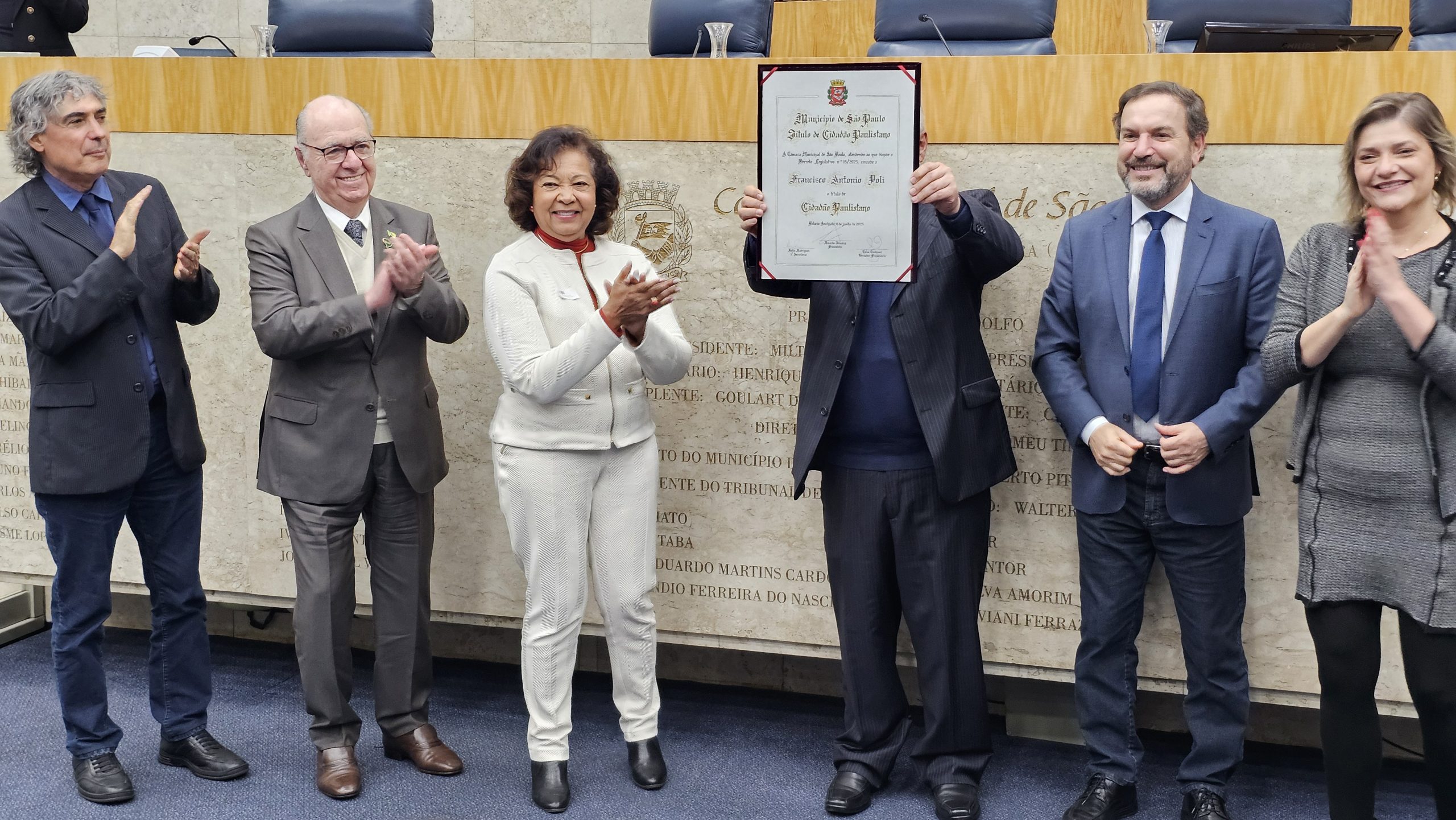 A Câmara Municipal de São Paulo concedeu na noite desta segunda-feira, dia 20 de outubro, o Título de Cidadão Paulistano ao professor e presidente da Udemo, Francisco Antônio Poli. A iniciativa da homenagem foi do vereador Celso Giannazi, que também presidiu a Sessão Solene. A Apampesp esteve representada na cerimônia pela presidente, professora Walneide Romano.