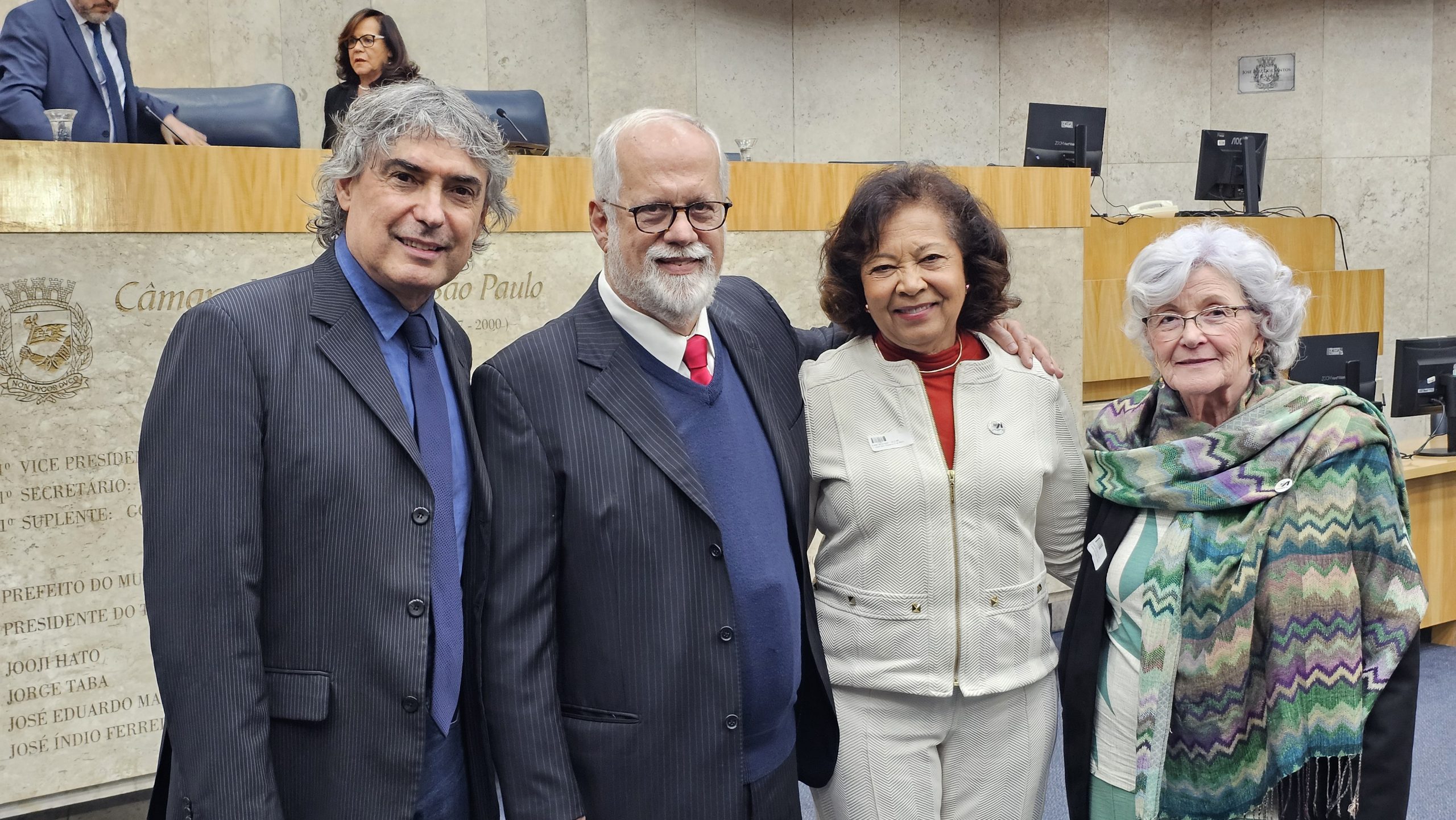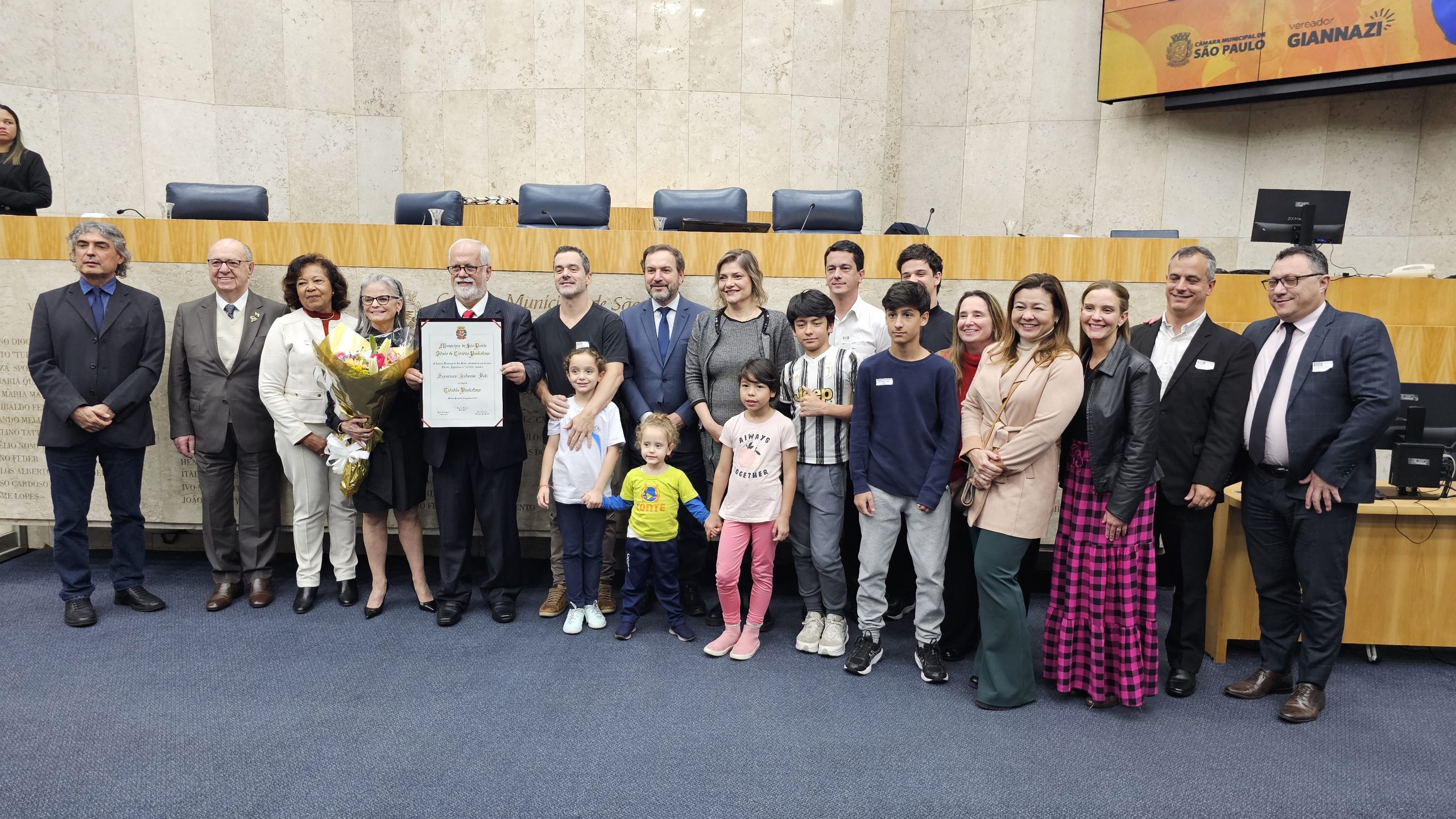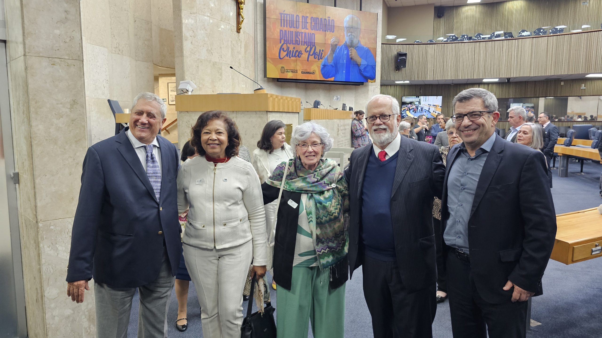 A Câmara Municipal de São Paulo concedeu na noite desta segunda-feira, dia 20 de outubro, o Título de Cidadão Paulistano ao professor e presidente da Udemo, Francisco Antônio Poli. A iniciativa da homenagem foi do vereador Celso Giannazi, que também presidiu a Sessão Solene. A Apampesp esteve representada na cerimônia pela presidente, professora Walneide Romano.