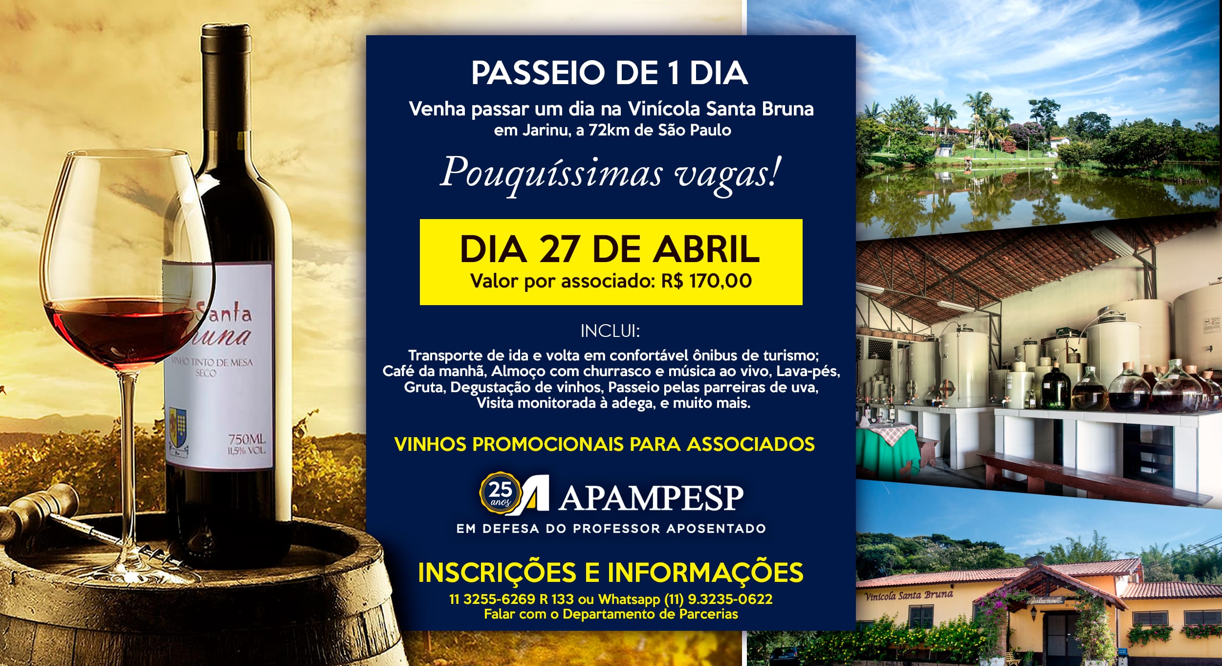 Dentro da programação especial de 25 anos, a Apampesp está promovendo um passeio pela Vinícola Santa Bruna, em Jarinu, a 72 km de São Paulo. O passeio será realizado no próximo dia 27 de abril e inclui transporte de ida e volta em um confortável ônibus de turismo, café da manhã, almoço com churrasco e música ao vivo, lava-pés, degustação de vinhos, passeio pelas parreiras de uva, visita monitorada à adega, e muito mais. Restam pouquíssimas vagas! Corra já para garantir a sua! Para se inscrever ou obter mais informações, […]
